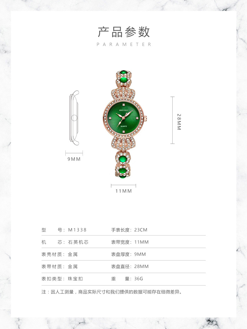 Buckle style: jewelry buckle       Buckle material: brass             Strap material: alloy