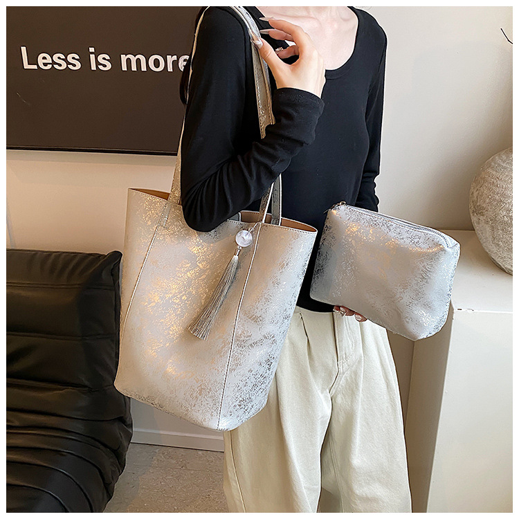 Large Capacity Bucket Bag Shoulder Tote Bag First Layer Cowhide 2 Pieces Set